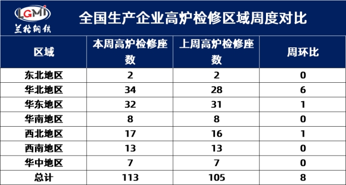 二、全國(guó)生產(chǎn)企業(yè)高爐檢修區(qū)域?qū)Ρ?/p> 據(jù)蘭格調(diào)研:201家樣本高爐企業(yè)中,有113座高爐檢修。其中:東北地區(qū)2座高爐檢修,華北地區(qū)34座高爐檢修,華東地區(qū)32座高爐檢修,華南地區(qū)8座高爐檢修,西北地區(qū)17座高爐檢修,西南地區(qū)13座高爐檢修,華中地區(qū)7座高爐檢修。